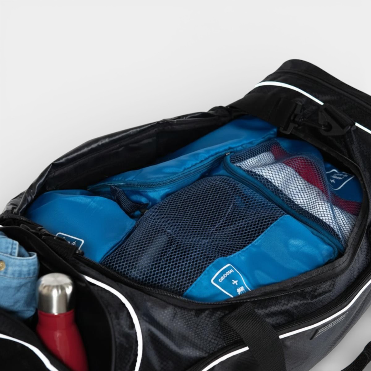 Bolsos laterais externos, perfeitos para garrafas, itens de higiene ou eletrônicos;