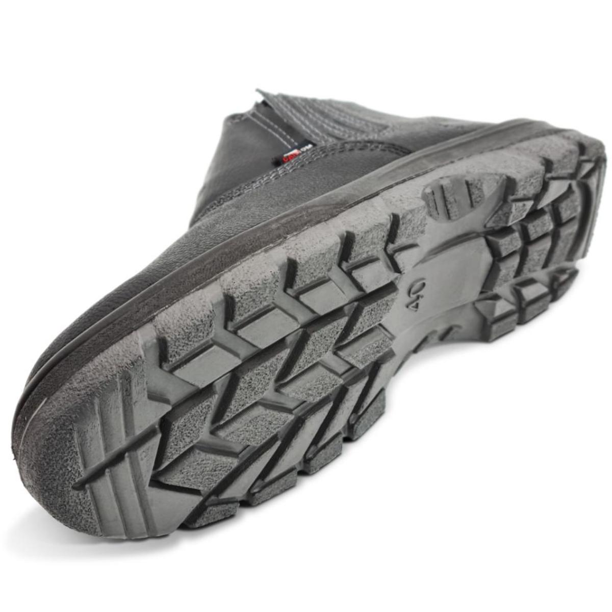diretamente no cabedal, sendo a 1° camada (entressola) mais macia e leve proporcionando maior conforto, a 2° camada é a mais resistente a objetos cortantes, perfurantes e a abrasão. O solado com estabilizador possui sistema antipronação, canais de escoamentos mais espaçados, ranhuras de aderência na região frontal e traseira e desenho plantar rebaixado. O modelo é ideal para trabalhos na área de construção civil, na industria, na petrolífera e serviços em geral, sendo confortável e protegendo contra riscos de impacto de natureza leve.