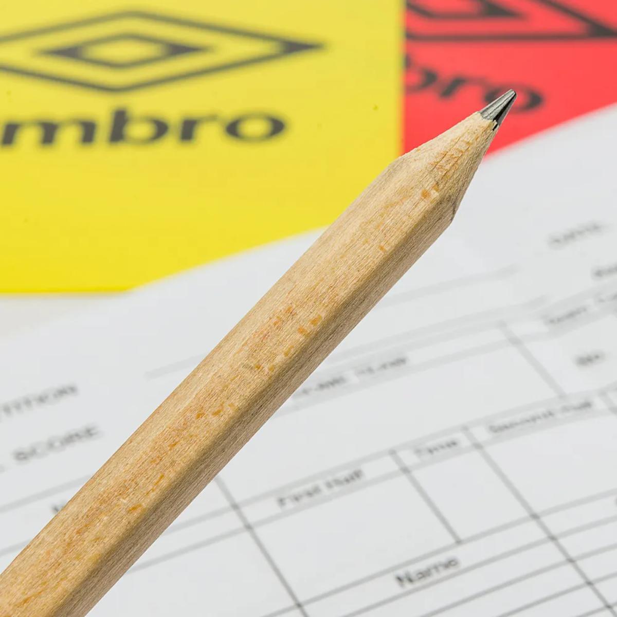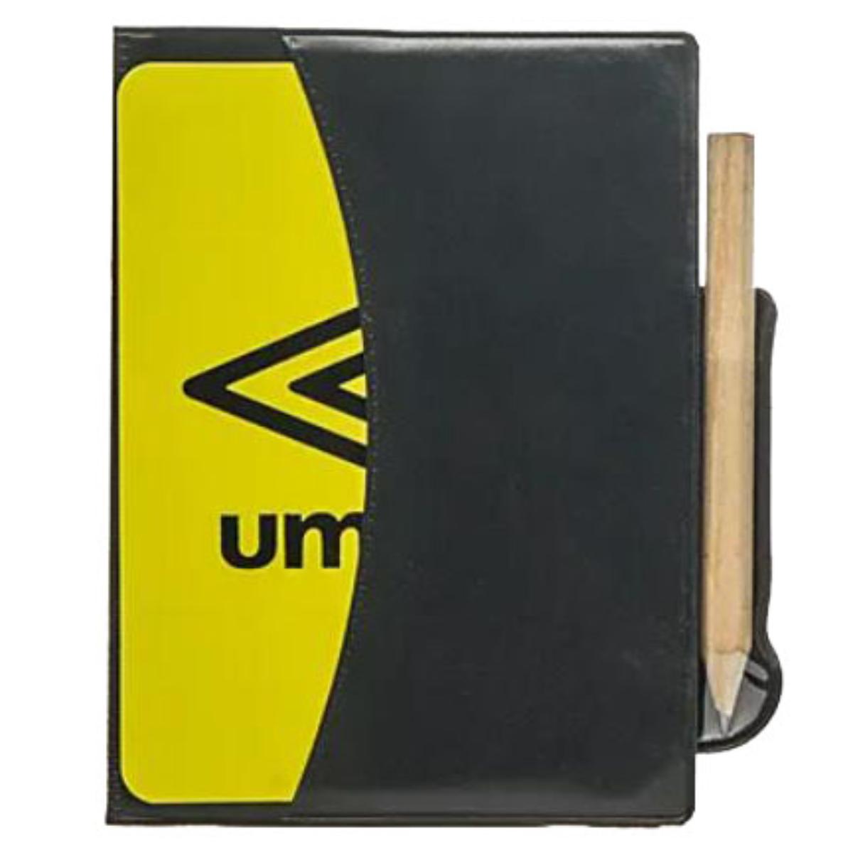 Cartões de árbitro (amarelo e vermelho) com espaço para anotações durante os jogos. Acompanha carteira para o transporte dos cartões e lápis para anotação. Logo Umbro estampado