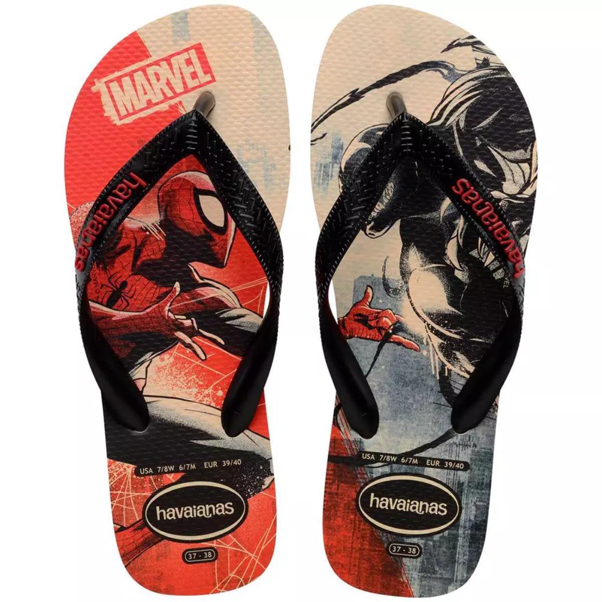 Dos quadrinhos diretamente para os seus pés! O chinelo Havaianas Top Marvel Classics foi feito especialmente para quem é fã de super-heróis. Modelo top, com as tiras mais grossas, essa sandália traz os maiores super-heróis de todos os tempos estampados na sola. São dois novos modelos com estampa vintage para você escolher o que mais combina com você. Além disso, a tira ainda conta com o icônico logo da Havaianas em destaque. Para você se sentir o próprio Homem-Aranha.
