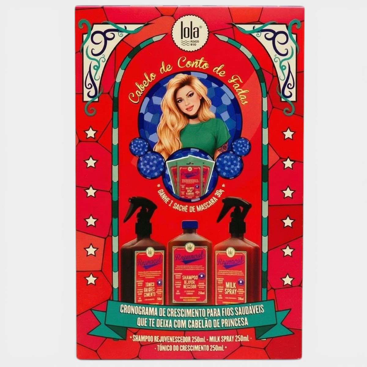 Kit Lola Rapunzel Estímulo ao Crescimento, Fortalecimento e Redução de Queda. Kit capilar indicado para todos os tipos de cabelos, especialmente para cabelos danificados ou com tendência à queda, o Kit Lola Rapunzel composto por Shampoo Rejuvenescedor com 250 ml, Leave-in Milk Spray com 250 ml e Tônico do Crescimento com 250 ml e um Sachê de 30g, estimula o crescimento capilar, fortalece a fibra capilar e reduz a queda, além de melhorar a saúde do couro cabeludo e promover hidratação profunda.