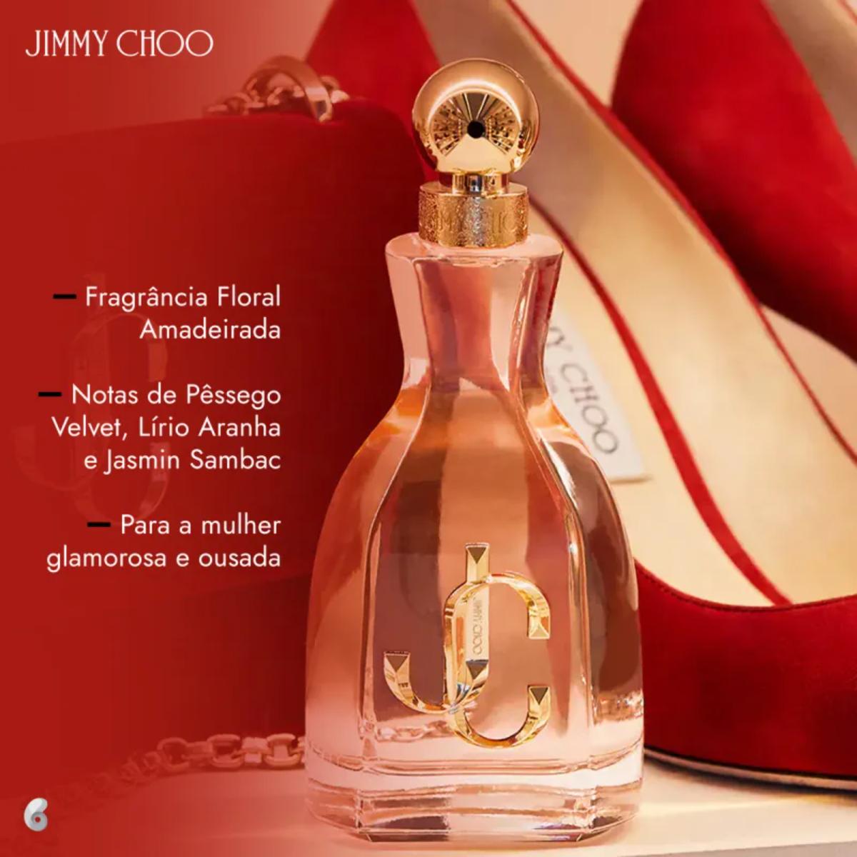 I Want Choo é um perfume Jimmy Choo feminino floral gourmand amadeirado. Um aroma que explode de alegria e com um toque sedutor. O Perfume I Want Choo, de Jimmy Choo destaca a essência da mulher que representa a marca : glamorosa, confiante, divertida e sempre cheia de alegria. A fragrância sensual é inspirada pela atmosfera em que as amigas se preparam para festejar pela noite. Uma nota cítrica de tangerina contrasta com as suaves nuances aveludadas do pêssego. No topo, uma nota cítrica de suco de mandarina contrasta com as nuances suaves e aveludadas de pêssego. As notas de corpo de baunilha do lírio vermelho se misturam com as vibrações sensuais do jasmim sambac, finalizando com as notas de fundo de baunilha e benjoim, que ancoram a fragrância de Jimmy Choo I Want Choo de forma profunda e alegre.