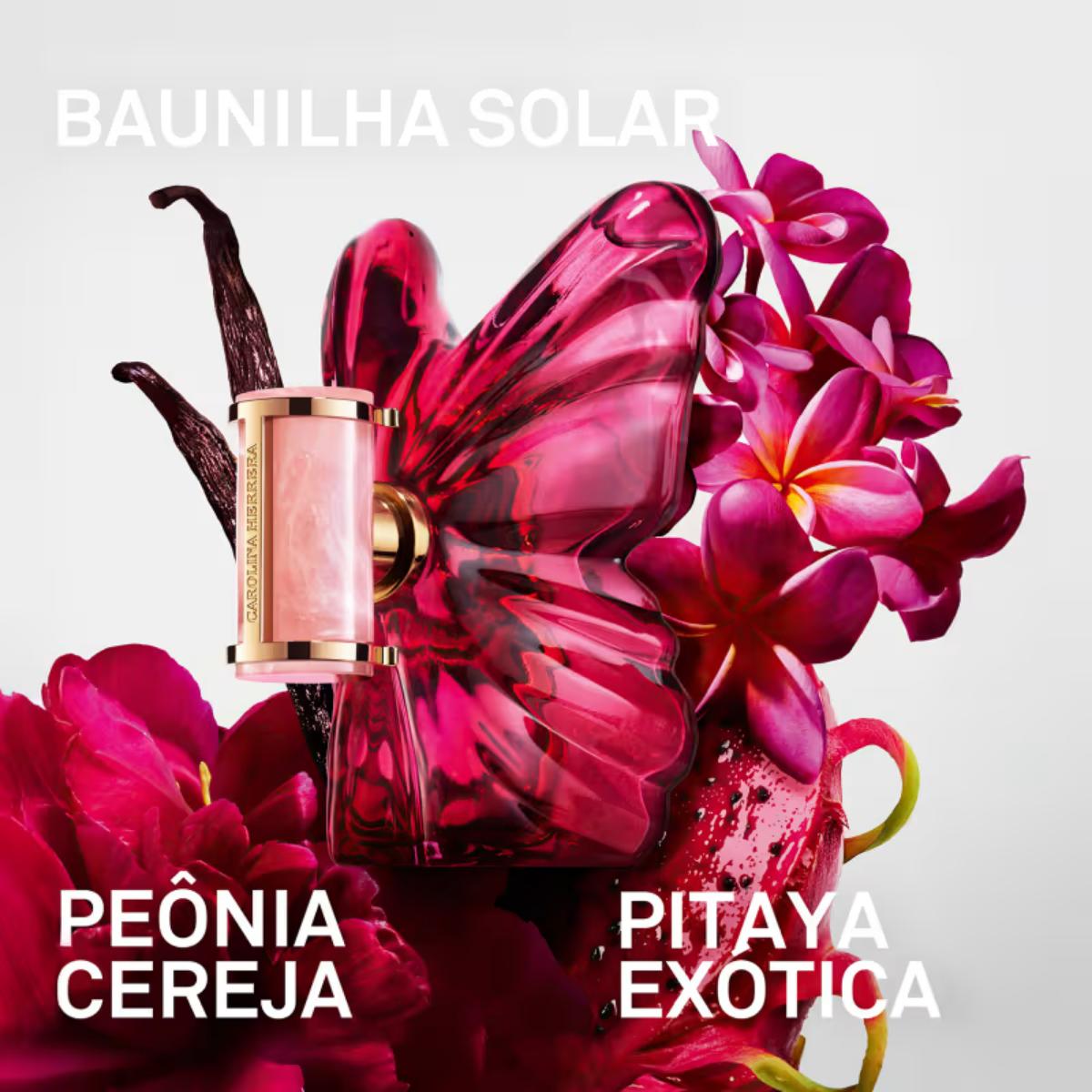 O Perfume La Bomba, de Carolina Herrera, traz uma composição olfativa foi desenvolvida com notas exclusivas de Pitaya exótica, nuances de Peônia cereja e um fundo quente de Baunilha solar, criando um aroma envolvente e contemporâneo. O perfume apresenta uma construção olfativa floral frutada, ideal para mulheres que buscam uma fragrância marcante e expressiva, com intensidade moderada e grande poder de fixação. A composição combina elegância e sensualidade, proporcionando uma experiência sensorial única, com um aroma que se renova a cada aplicação. O frasco em formato de borboleta simboliza liberdade e transformação, refletindo o conceito de libertação e autocelebração da fragrância. A composição foi desenvolvida para destacar a energia contagiante e a personalidade vibrante da mulher moderna, com uma proposta olfativa que traduz feminilidade e sofisticação.
