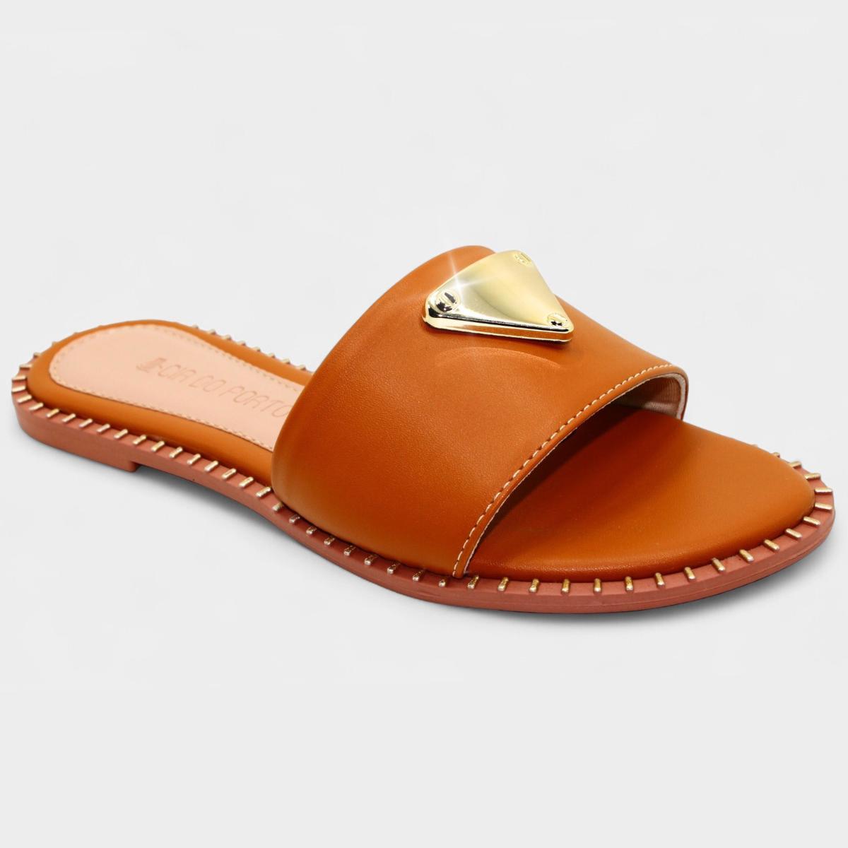Nome:Rasteira Cia do Porto Estilo Dourado Feminina - Caramelo