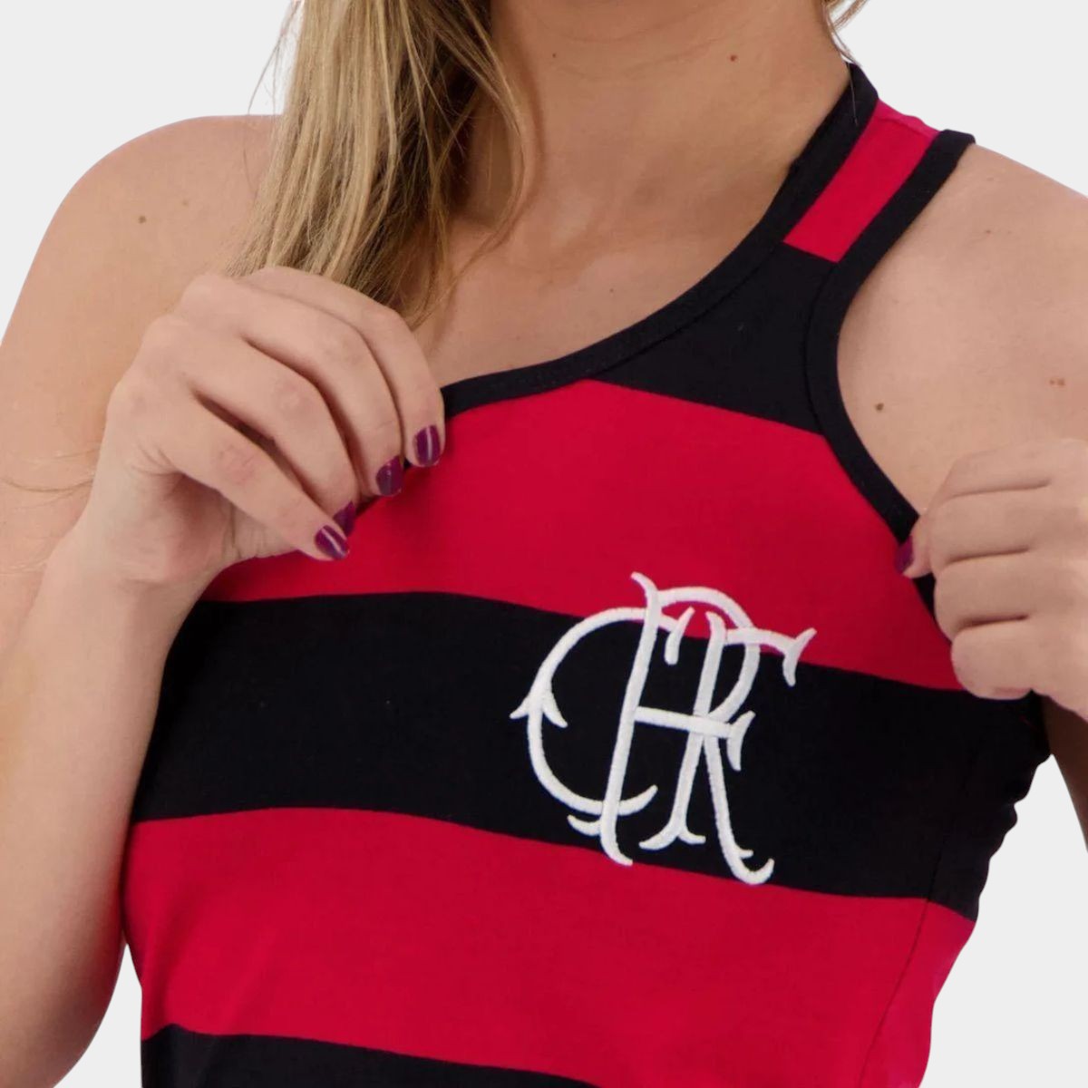 Confeccionada com algodão macio e confortável, a regata feminina do Flamengo, modelo Fla-Tri, é ideal para as torcedoras do Mengão mostrarem sua paixão no dia a dia. Seu design apresenta faixas horizontais em vermelho e preto, contendo ainda punho das mangas e gola na cor preta. A manga, por sua vez, tem corte nadador, concedendo muito charme ao visual. Por fim, do lado esquerdo do tórax, o escudo retrô do time marca presença, bordado, fazendo referência ao utilizado nos anos de 1978 e 79 (especial), quando o time conquistou o tricampeonato carioca.