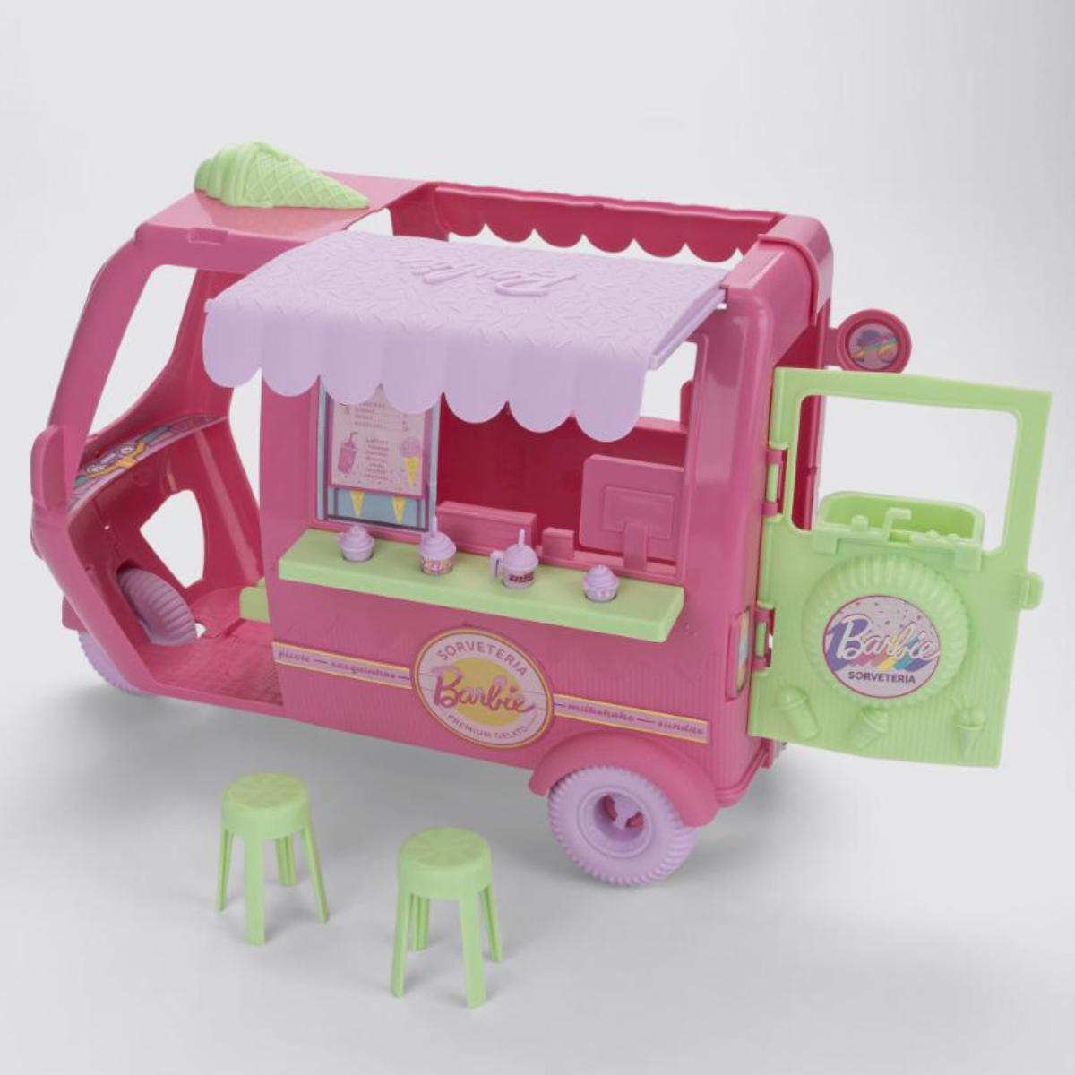 Uma combinação perfeita de conforto e imaginação! A sandália Barbie com sorveteria traz um design lúdico inspirado nos icônicos tuk-tuks indianos e acompanha uma incrível sorveteria em miniatura. Decorado com temática de sorvete, o brinquedo possui rodinhas funcionais, toldo retrátil, porta traseira para acesso das bonecas, banco para a motorista e topo com um divertido sorvete derretido. Vem com diversos acessórios para estimular a criatividade: dois bancos na altura ideal para a Barbie, pia, máquina de milkshake, colher de sorvete e seis preparos prontos para soltar a imaginação.