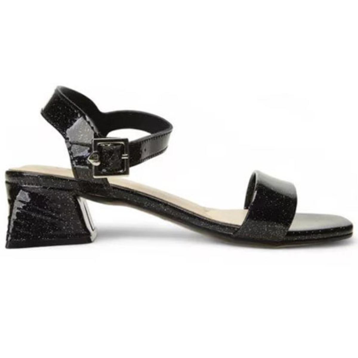Confeccionada em material sintético, tem solado de borracha, salto baixo, fivela com ajuste regulável e acabamento com brilho na tira. Produção fashion garantida!