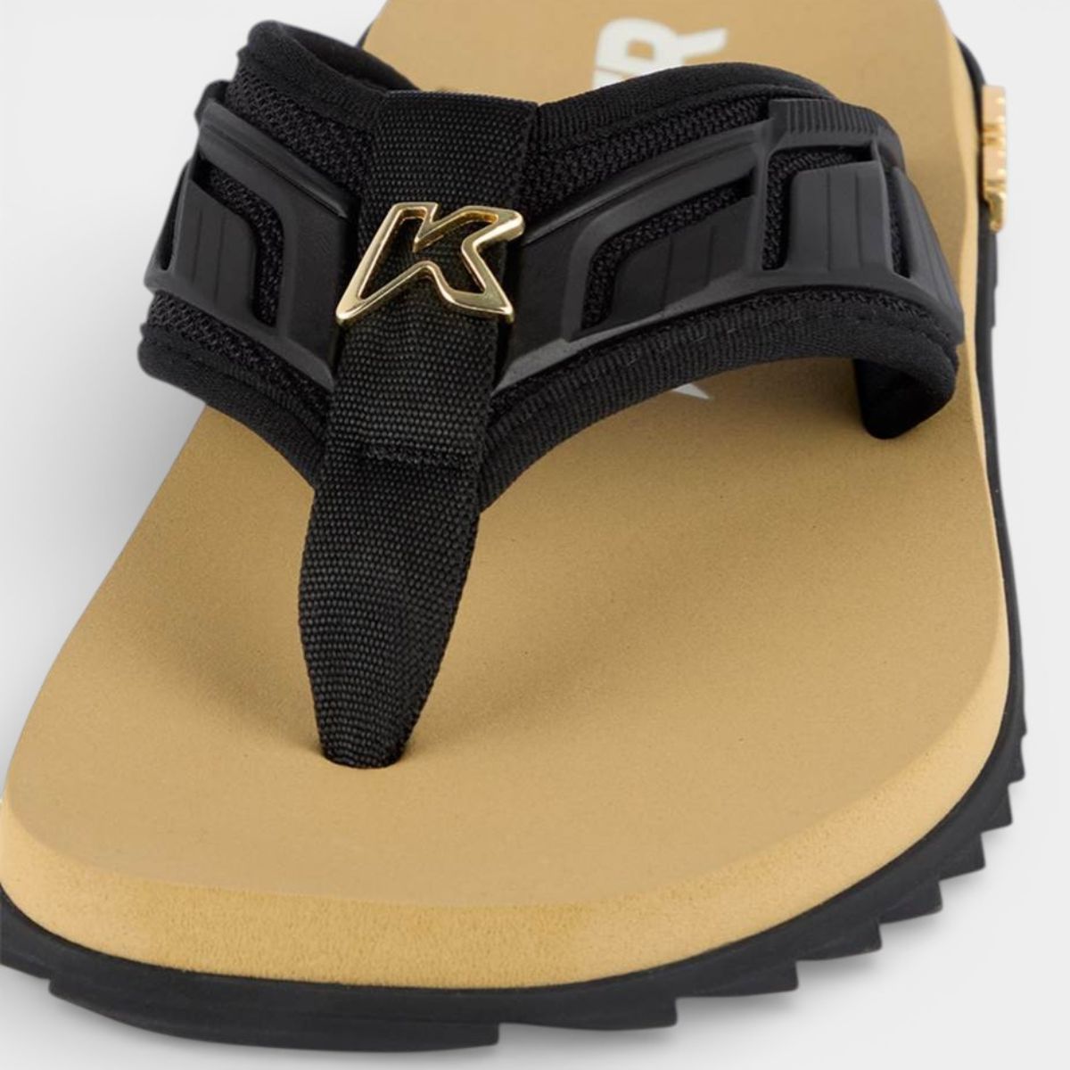 Cabedal tridimensional em gel com revestimento - Identificador K vazado em metal escovado - Palmilha extramacia - Solado de borracha vulcanizada.