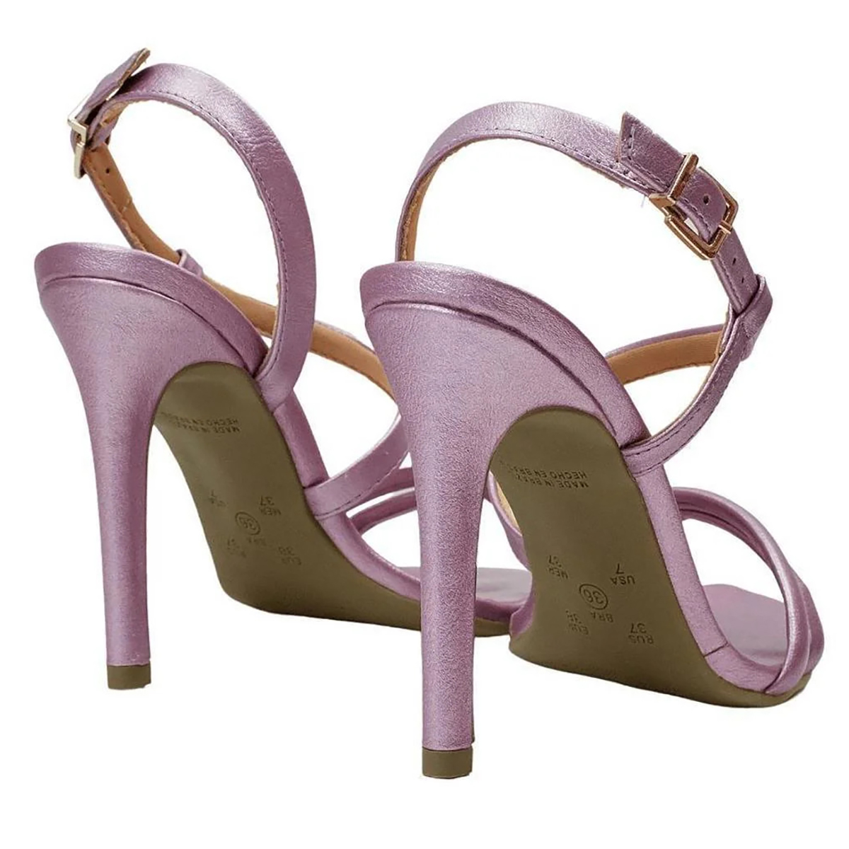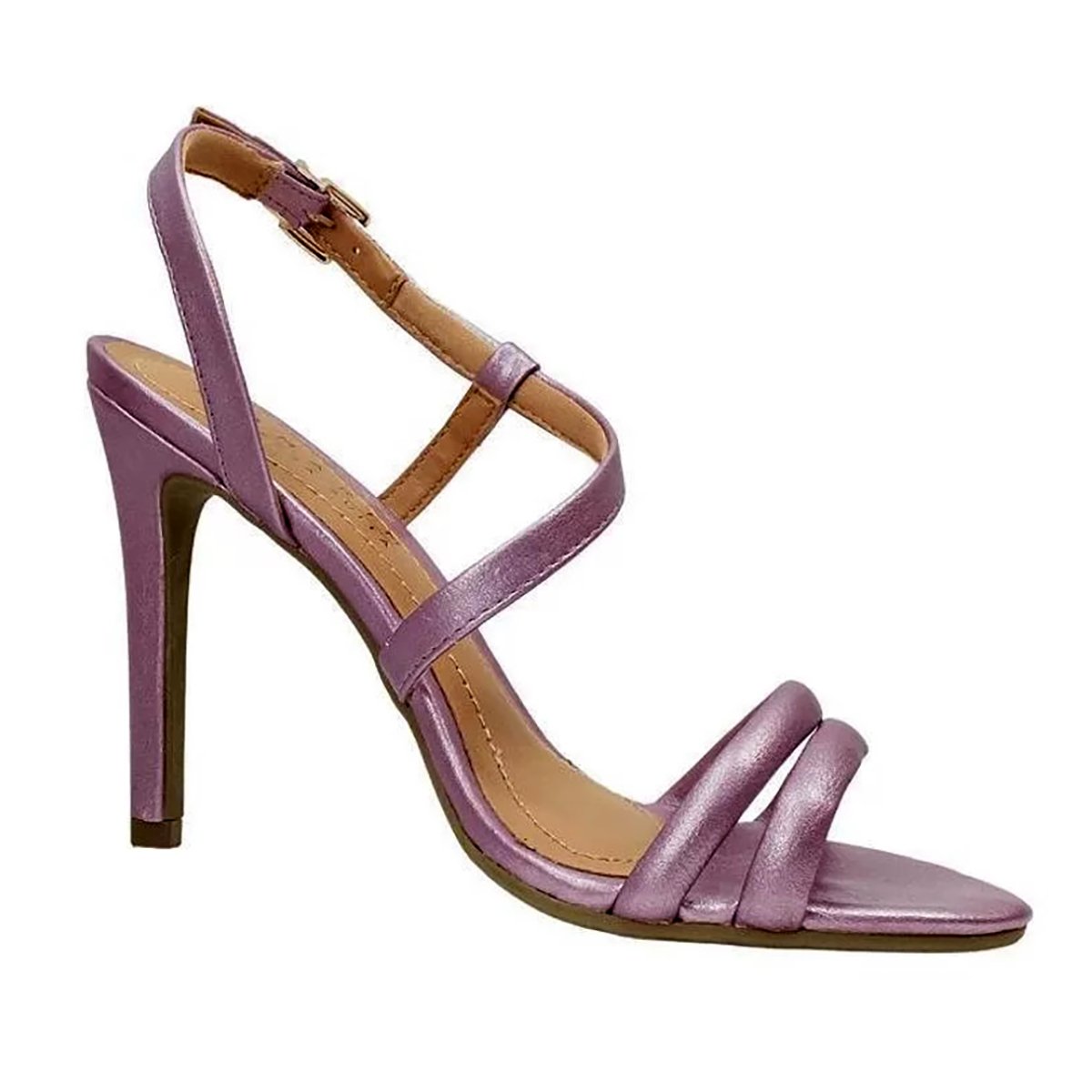 Confeccionada em sintético metalizado, tem salto médio e fino e fechamento de fivela, dando um destaque a mais ao modelo.