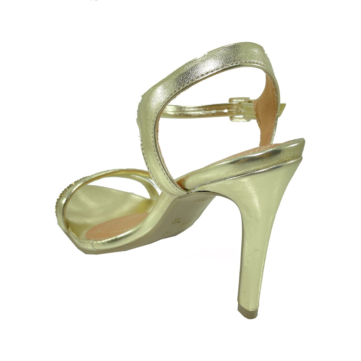 Confeccionada em sintético metalizado, tem salto médio e fino e fechamento de fivela, dando um destaque a mais ao modelo.