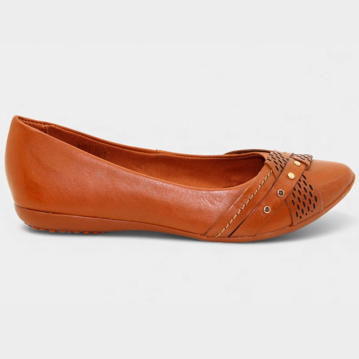 Nome:Sapatilha Couro Bottero Bico Fino Microperfuros Apliques Feminina - Caramelo