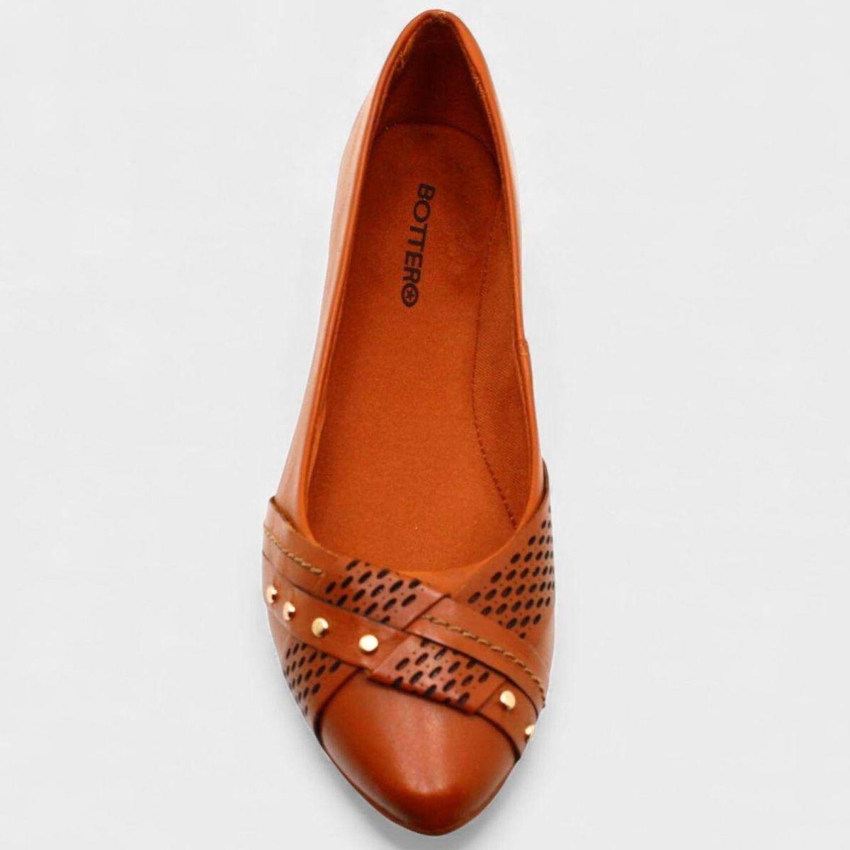 Sapatilha Couro Bottero Bico Fino Microperfuros Apliques Feminina - Caramelo