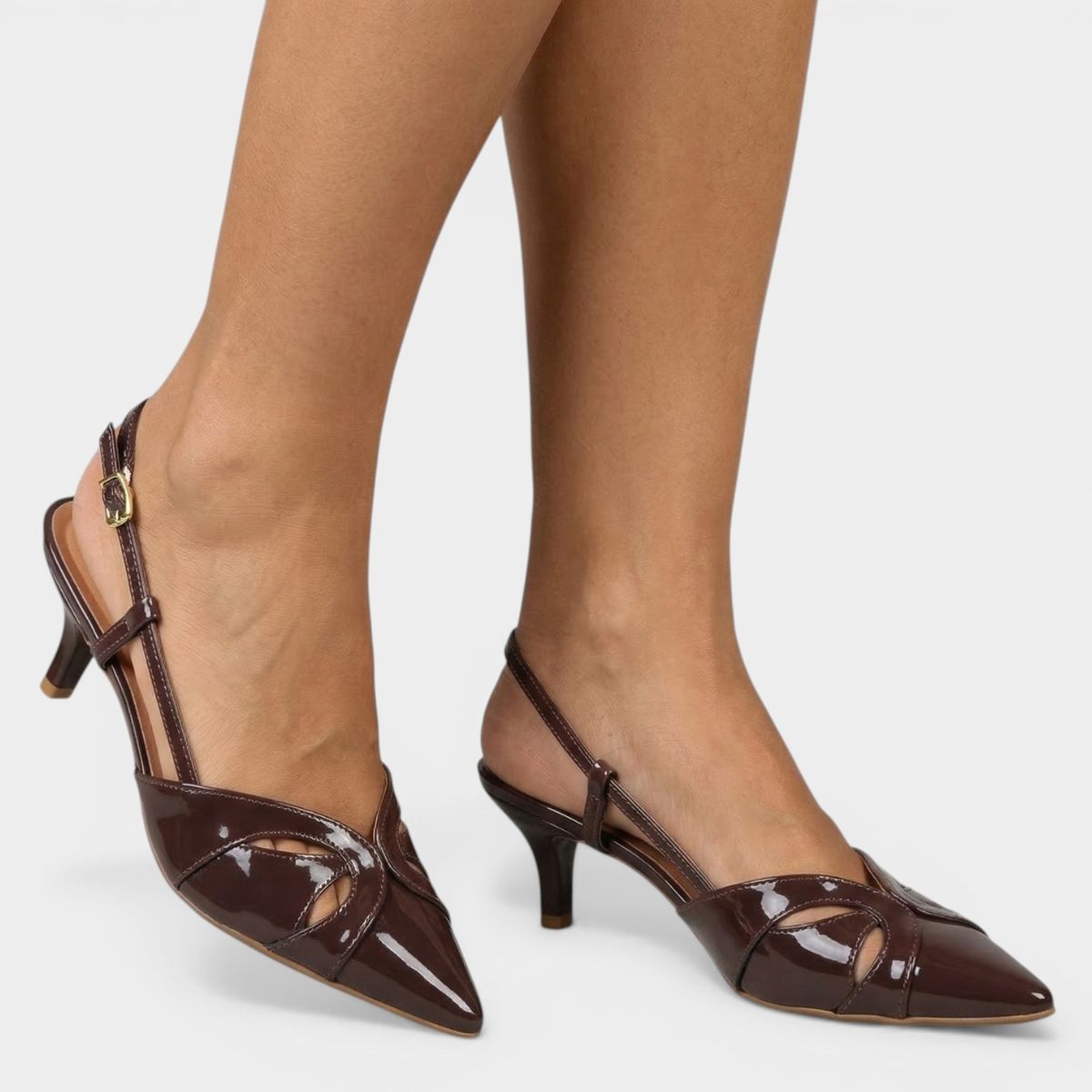 Scarpin Vizzano Slingback Bico Fino Verniz Salto Baixo - Marrom Escuro